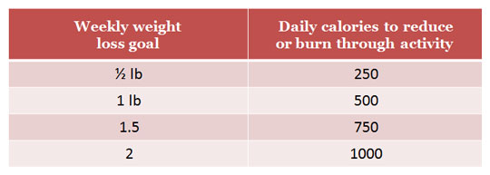 Set a short term and long term goal and write them down. In doing so, you make a commitment to yourself which helps propel you into immediate action. Healthy weight loss for most people is half a pound to two pounds per week but the more weight you have to lose, the faster you can lose it. One pound of body fat contains approximately 3,500 calories. Use the table below to determine how many extra calories you’ll have to burn or cut out of your diet each day for different weight loss goals.