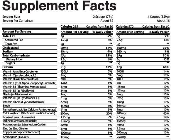 Micellar Casein, Whey Protein Isolate), Fat Blend (Sunfower Oil, Medium Chain Triglycerides and Safflower Oil), Natural and Artifcial Flavors, Gums (Carboxymethyl Cellulose, Xanthan Gum), Vitamin and Mineral Blend, Aminogen®, Sweeteners (Sucralose, Acesulfame Potassium).